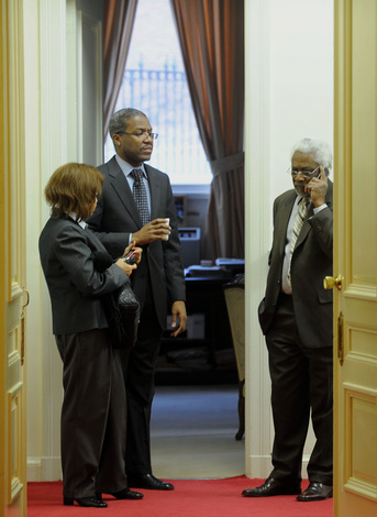 SLUG: ph-haiti DATE: January 13, 2010 NEG NUMBER: 211991 LOCATION: Embassy of Haiti Massachusetts Avenue, NWi PHOTOGRAPHER: GERALD MARTINEAU, for TWP CAPTION: Haitian Ambassador to the U.S. Raymond Joseph talks on the phone with Embassy associates just before he holds a press conference to address the earthquake in his country. StaffPhoto imported to Merlin on Wed Jan 13 09:06:08 2010