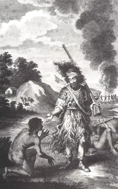 Frontispiece to the 1785 edition of Daniel Defoe’s 1719 novel, Robinson Crusoe, vol. I. Illustrated by Mather Brown, engraved by Robert Pollard, From Blewett, Illustration of Robinson Crusoe.